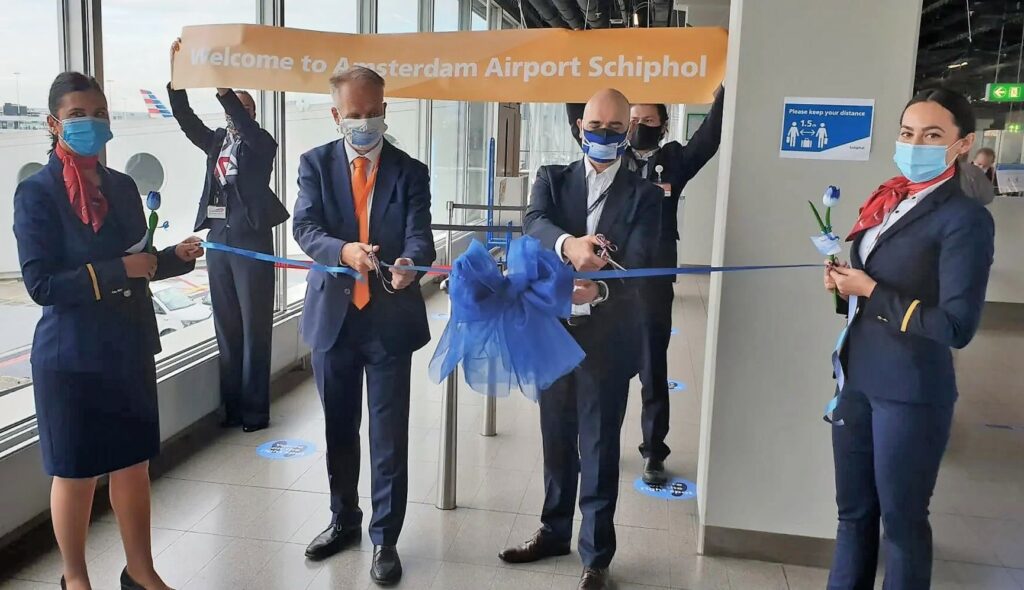 Foto: Bij de inaugurele vlucht van Boekarest naar Schiphol in oktober 2020, met Marcel Lekkerkerk (Marketing Diretor Route & Business Development Royal Schiphol Group) en Krassimir Tanev, Chief Commercial Officer Blue Air (Archieffoto TravMagazine).