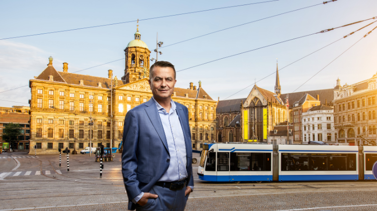 Foto: Atilay Uslu voor het Koninklijk Paleis op de Dam. Het W Amsterdam ligt achter het Koninklijk Paleis.