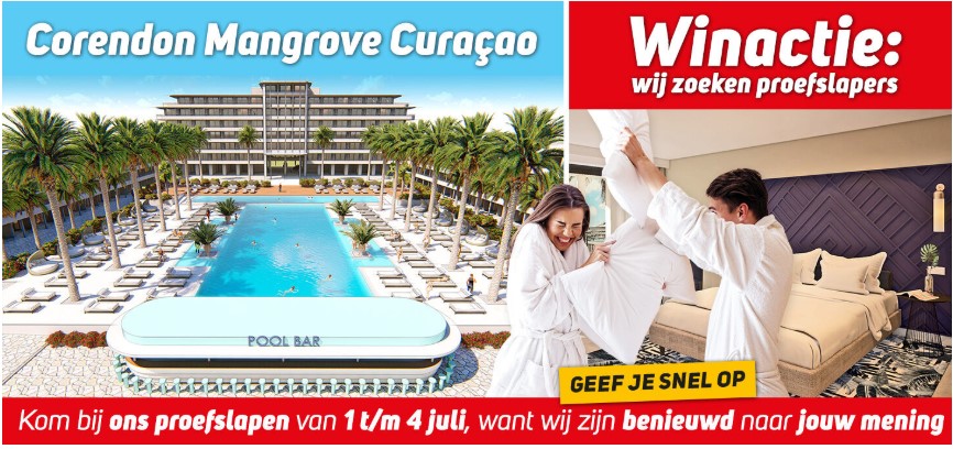 Aanmelden kan vóór woensdag 24 juni 12.00 uur. De gelukkige proefslaper vliegt samen met Corendon én een introducé op 1 juli naar Dushi Curaçao om 3 dagen lang gratis te genieten van het Ultra All Inclusive Corendon Mangrove Beach Resort.