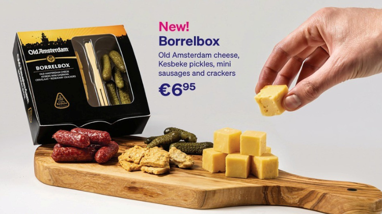 De borrelbox bevat augurken van Kesbeke, een pittige kaas van Old Amsterdam, rozemarijncrackers en cervelaatworst. De box is samengesteld door Foodcase. Daarmee brengt Transavia een stukje Hollandse gezelligheid naar tien kilometer hoogte, met smaken die voor veel passagiers vertrouwd zijn en voor internationale passagiers een eerste kennismaking zullen zijn met typisch Nederlandse borrelsnacks.