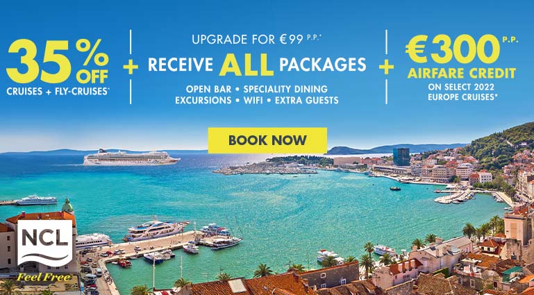 En nu met Norwegian Cruise Line (NCL) €300 vliegtegoed per persoon voor geselecteerde 2022 Europa cruises, te combineren met andere promoties zoals 35% korting op alle cruises en Fly-Cruise en ALL Free at Sea vakantie upgrade pakketten: Open Bar. Specialiteiten-restaurants. Excursies. Wifi. En nog veel meer. Feel Free met Europe’s Leading Cruise Line (World Travel Awards). Meer info: www.ncl.com/promotions