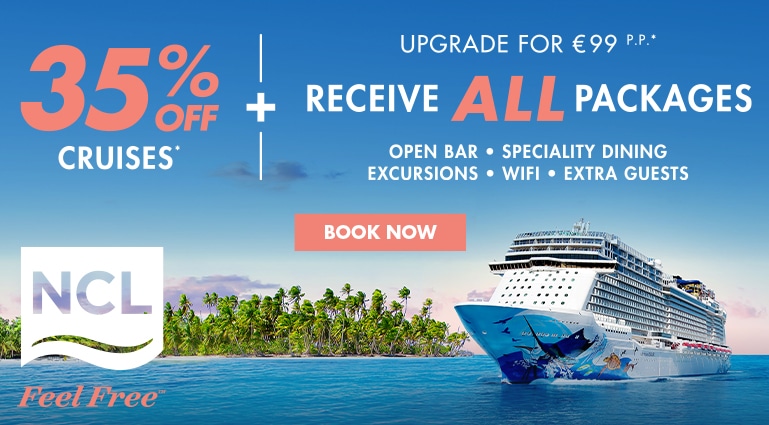 En tot 15 november krijgen uw klanten niet alleen 35% korting op alle cruises, maar kunnen ze ook ALLE Free at Sea vakantie upgrade pakketten krijgen voor €99 p.p. op een 7-daagse cruise.