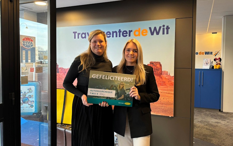 Sanne ontvangt van Sunny Cars een autohuurcheque ter waarde van 500 euro. ‘Deze cheque komt heel goed van pas’, zegt de winnares.