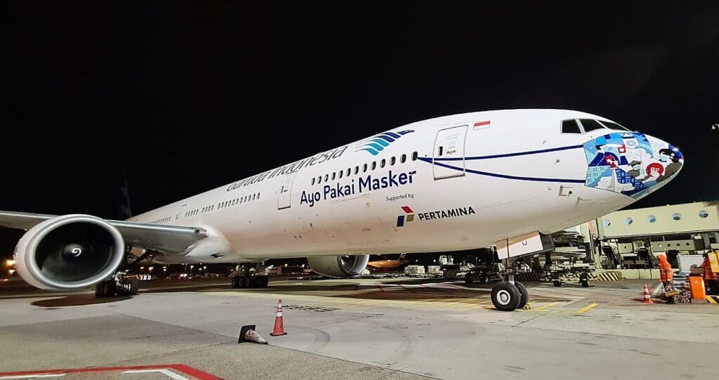 Garuda Indonesia is vrijdag met een speciale livery in Amsterdam geland. Het gaat om een 777-300ER voorzien van een speciaal mondmasker.