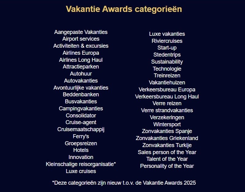 De Vakantie Awards bestaan uit verschillende categorieën waarop reisprofessionals hun stem kunnen uitbrengen. Wilt u met uw bedrijf kans maken op de Vakantie Awards, nomineer hier uw bedrijf. Graag ontvangen wij uw reactie uiterlijk maandag 3 november aanstaande, waarna het stemformulier wordt klaargezet en de gehele reisbranche zijn stem kan uitbrengen.