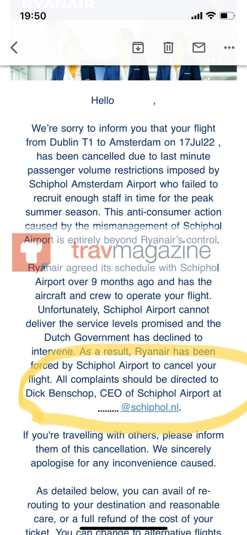 ‘Het spijt ons u te moeten meedelen dat uw vlucht van Dublin naar Amsterdam op 17 juli 2022 is geannuleerd vanwege last-minute beperkingen die zijn opgelegd door Schiphol Amsterdam Airport, dat niet op tijd genoeg personeel kon werven voor het hoogseizoen in de zomer. Deze anti-consumentenactie, veroorzaakt door het wanbeheer van Schiphol Airport, ligt volledig buiten de macht van Ryanair. Ryanair is ruim negen maanden geleden met Schiphol Airport tot een deal gekomen en heeft het vliegtuig en de bemanning om uw vlucht uit te voeren. Helaas kan Schiphol Airport niet de beloofde serviceniveaus leveren en heeft de Nederlandse regering geweigerd om in te grijpen. Als gevolg hiervan is Ryanair gedwongen door Schiphol Airport om uw vlucht te annuleren’, aldus de luchtvaartmaatschappij.